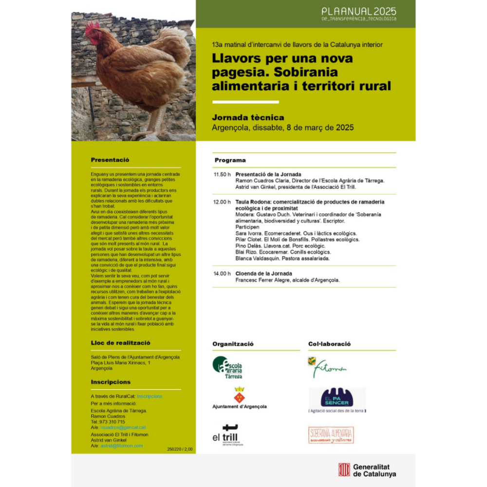 La jornada tècnica se celebrarà al Saló de Plens de l’Ajuntament d’Argençola (Plaça Lluís Maria Xirinacs, 1). L’acte s’iniciarà a les 11.50 h amb la presentació de la jornada a càrrec de Ramon Cuadros Claria, director de l’Escola Agrària de Tàrrega, i Astrid van Ginkel, presidenta de l’Associació El Trill.