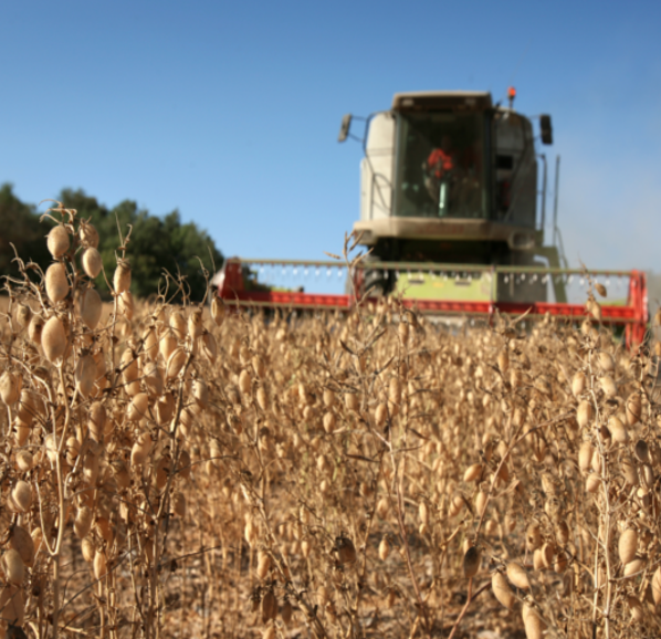 Durant l’agost la planta madura i s’asseca. Llavors es cullen les tavelles manualment. Un cop realitzada tota la collita, se separen les llavors de les tavelles a cops de bastó i es venten per a separar els cigrons de les restes de tavelles. Finalment es recullen i es trien manualment per acabar el procés d’assecament.